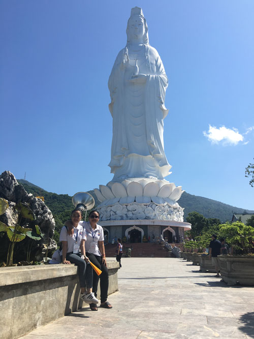 Hai cô gái đến từ Campuchia - Châu Ngọc Duyên và Phạm Ngọc Huyền không bỏ lỡ cơ hội chụp ảnh lưu niệm khi đến với chùa Linh Ứng Bãi Bụt.