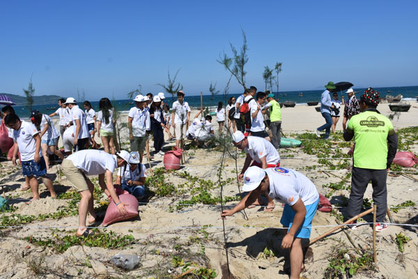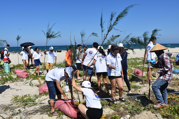 Chiều cùng ngày, các bạn trẻ kiều bào đã hăng hái tham gia trồng cây phi lao nhằm cải tạo môi trường biển.