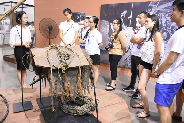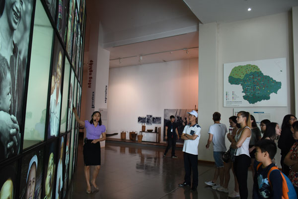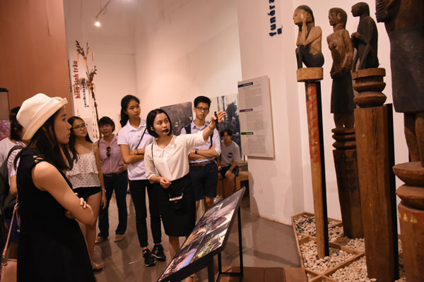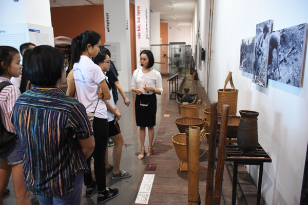 Các bạn trẻ nghe giới thiệu về trang phục của đồng bào các dân tộc tỉnh Đắk Lắk tại Bảo tàng tỉnh |