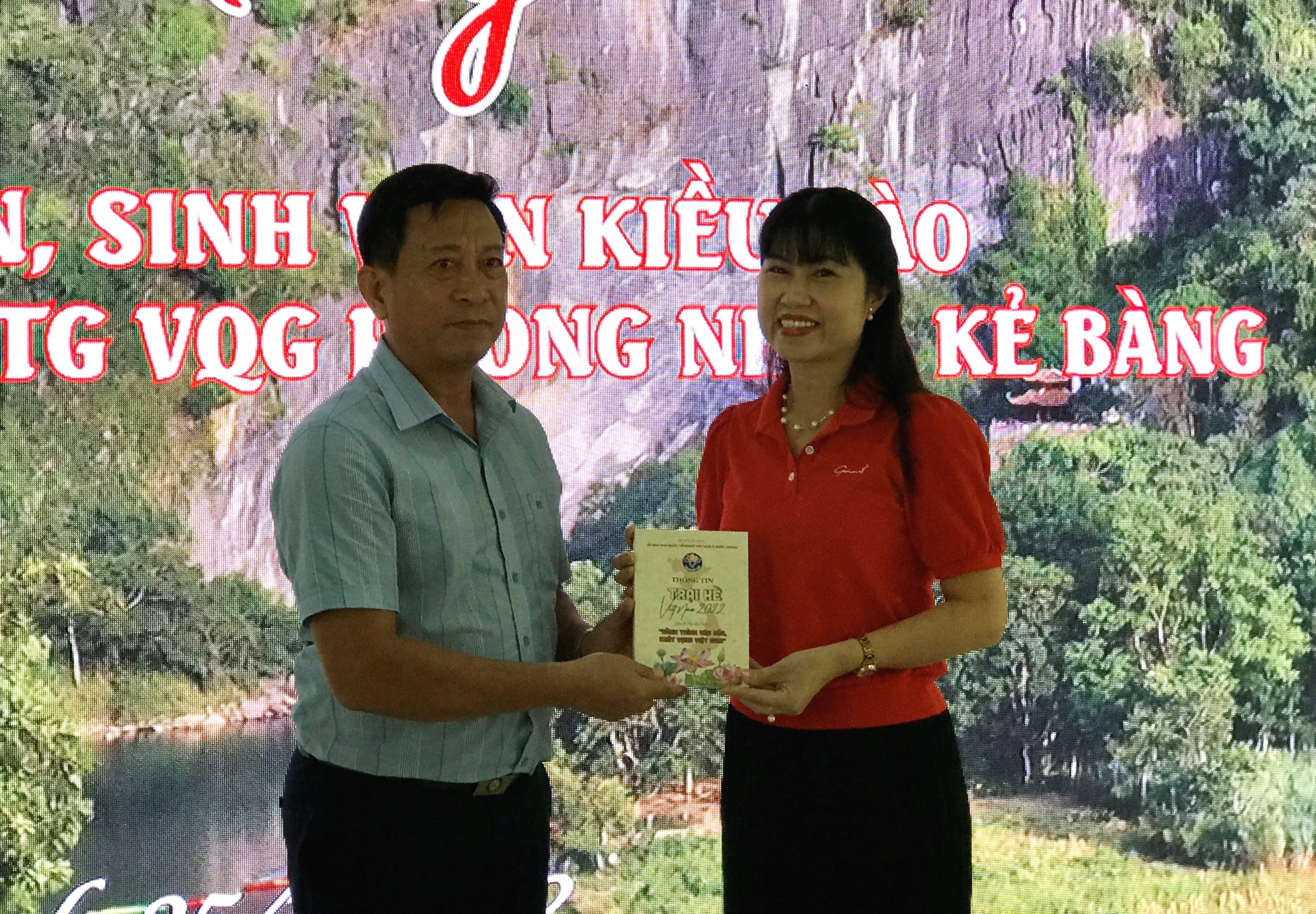 Nhân dịp này, bà Nguyễn Thị Thuận, Phó Vụ trưởng Vụ Thông tin - Văn hoá, Uỷ ban Nhà nước về người Việt Nam ở nước ngoài, thay mặt đoàn Trại hè Việt Nam 2022, tặng Ban quản lý Vườn Quốc gia Phong Nha – Kẻ Bàng cuốn sổ tay trại hè với những thông tin cơ bản về các thành viên đoàn Trại hè và một số địa danh nổi tiếng của đất nước trong chuyến hành trình Trại hè năm nay.