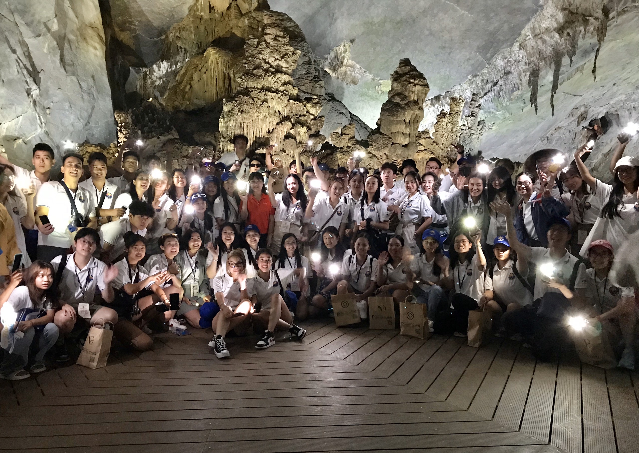 Các thanh niên kiều bào thích thú khi tham quan động Phong Nha. |