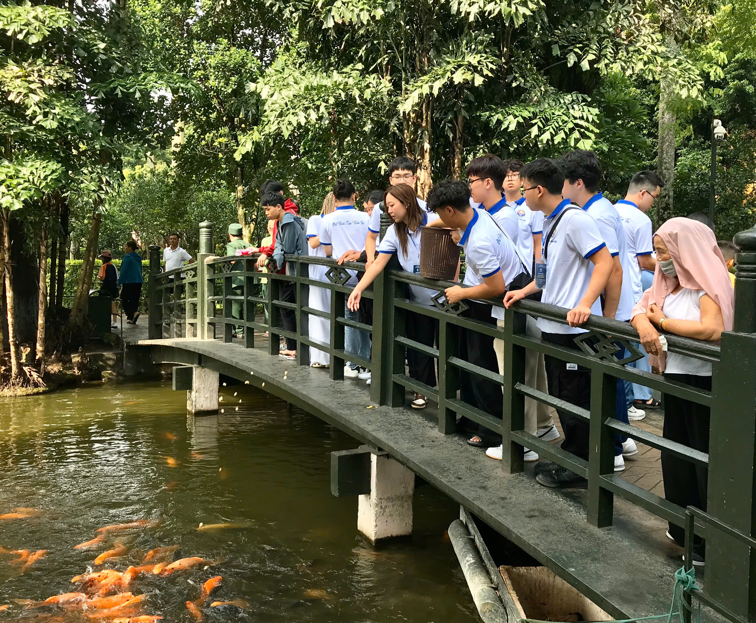 Các bạn trẻ kiều bào cho cá ăn trong ao cá Bác Hồ. Ảnh: Lan Phương |