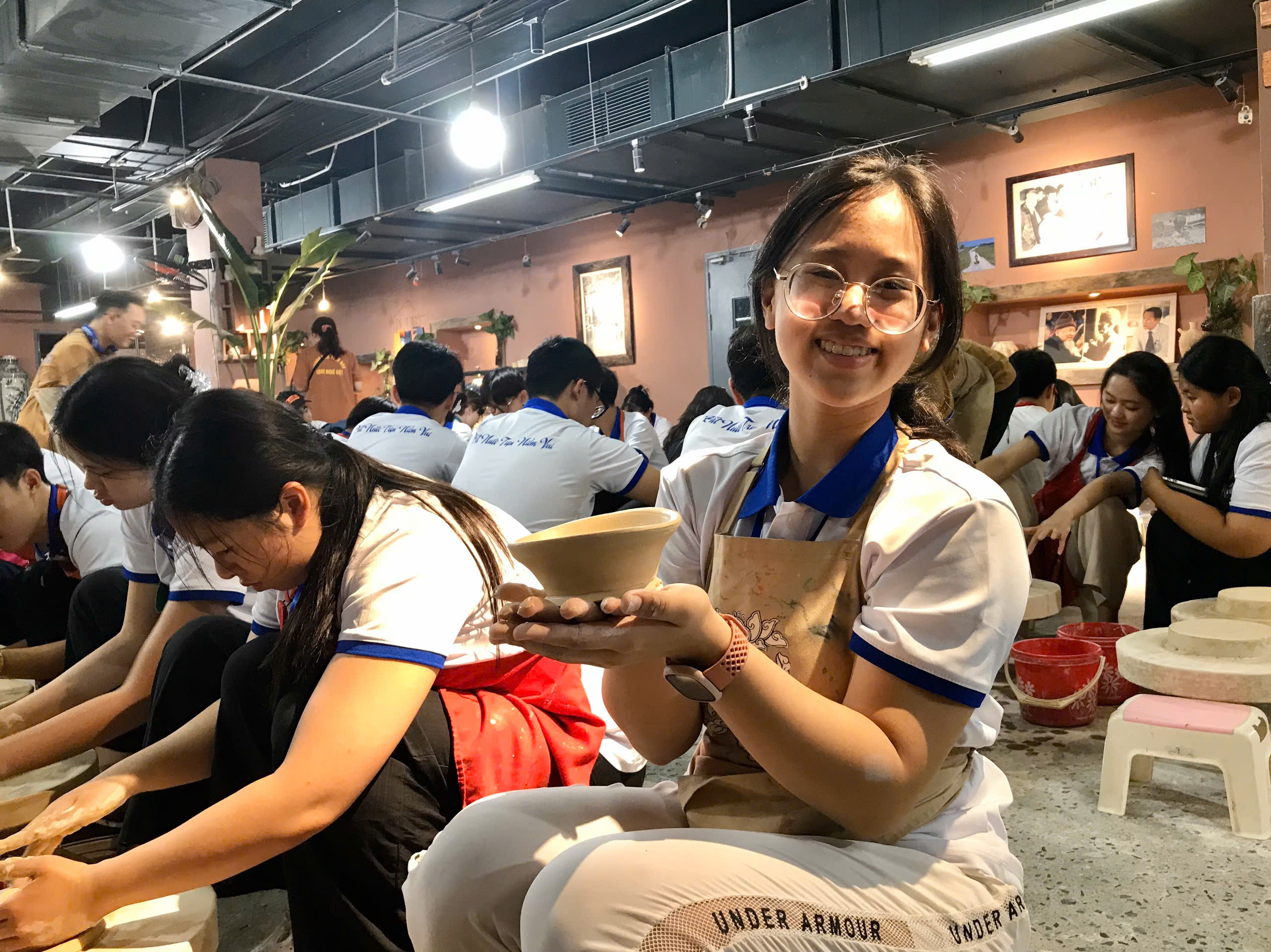 Trịnh Hiểu Thy, 17 tuổi, học sinh gốc Việt tại Singapore, hào hứng chia sẻ: "Lần đầu nặn gốm, em rất vui và đã làm cái bát ăn cơm trong 15 phút để tặng em gái. Khó khăn ban đầu là cố định sản phẩm vào bàn xoay bằng nước và đất sét. Trải nghiệm này giúp em hiểu thêm về văn hóa Việt Nam".