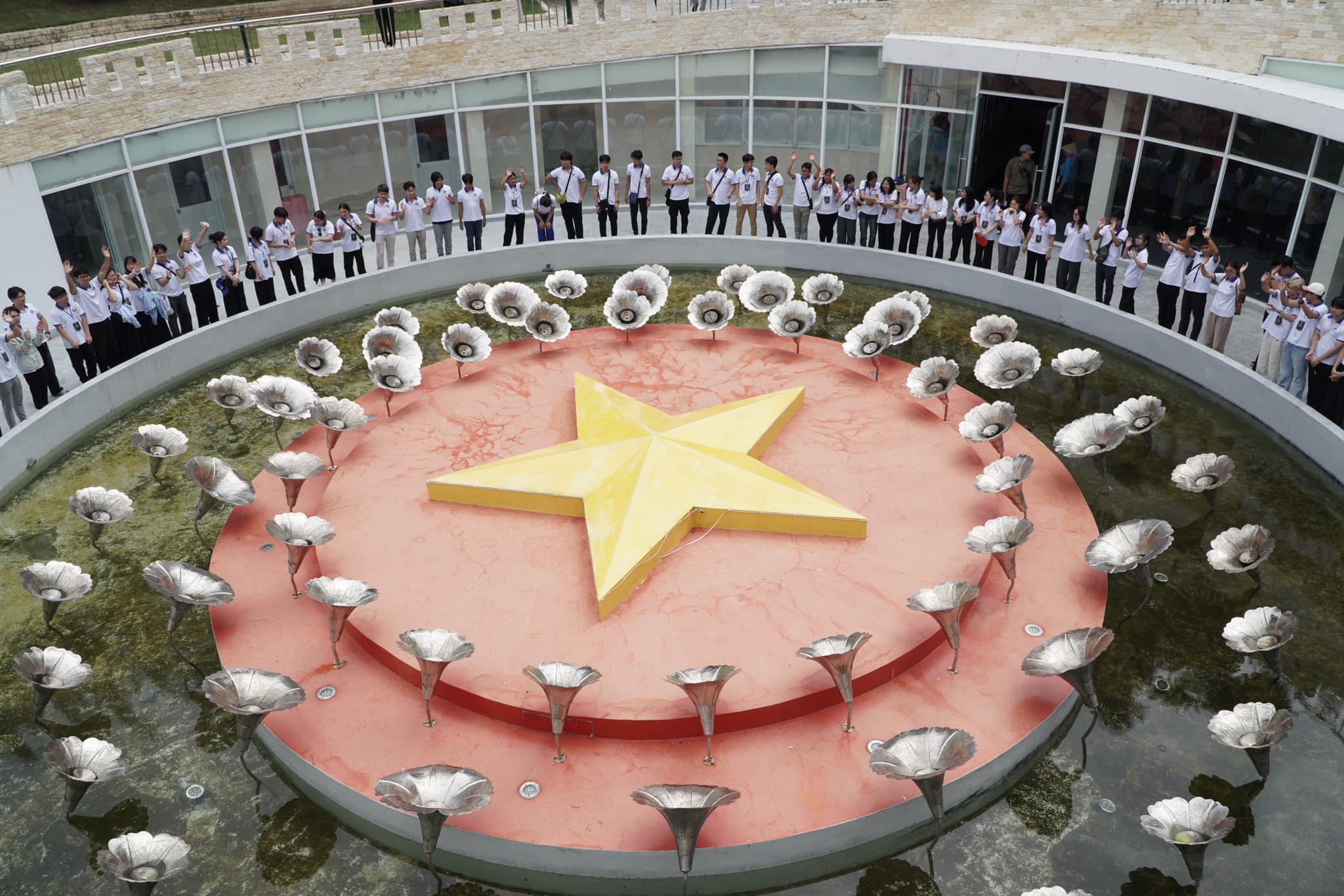 Các kiều bào trẻ đứng thành vòng tròn xung quanh 64 bông hoa muống biển tượng trưng cho 64 cán bộ, chiến sỹ đã ngã xuống. Ảnh: Tuấn Việt |