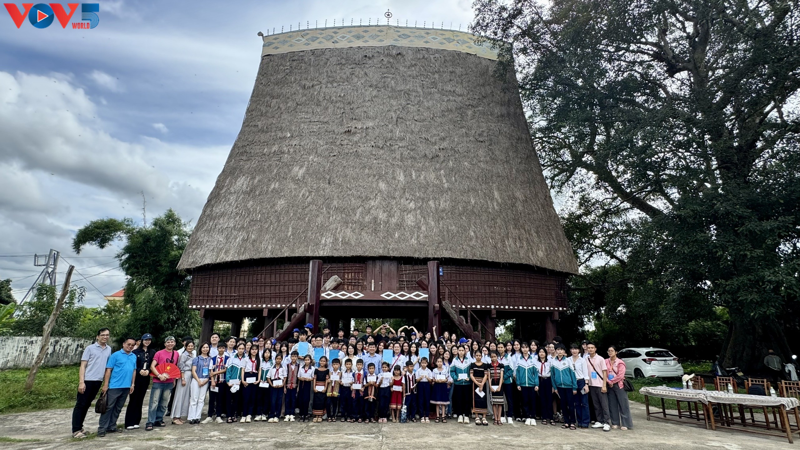 Sau khi thăm quan nhà Rông, đoàn thanh thiếu niên kiều bào trao tặng các món quà có ý nghĩa cho trẻ em địa phương. |