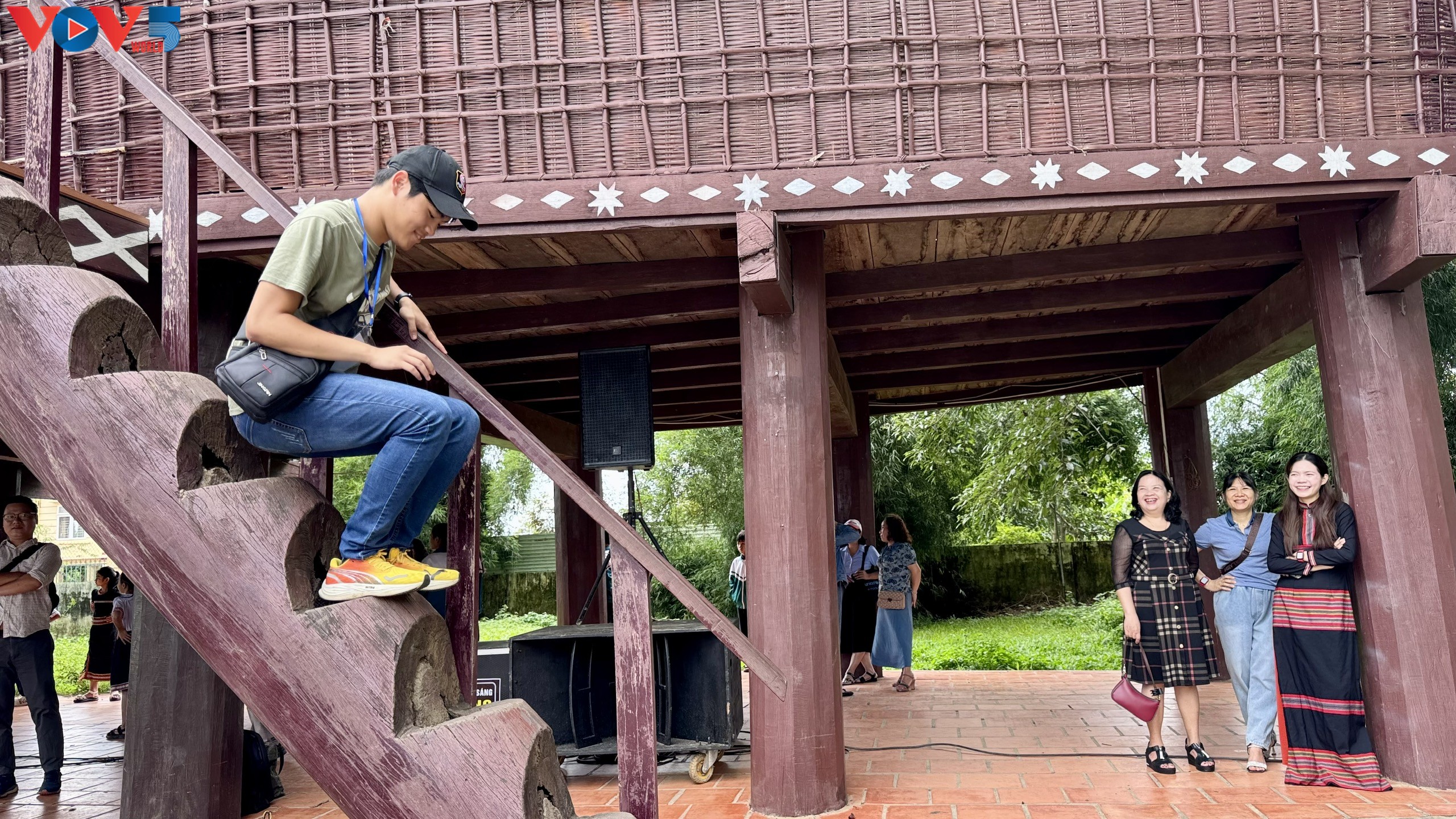 Thăm quan nhà Rông của đồng bào người Ba Na là một trải nghiệm thú vi với thanh thiếu niên kiều bào. Tự tin và thích thú leo thang lên nhà Rông. |