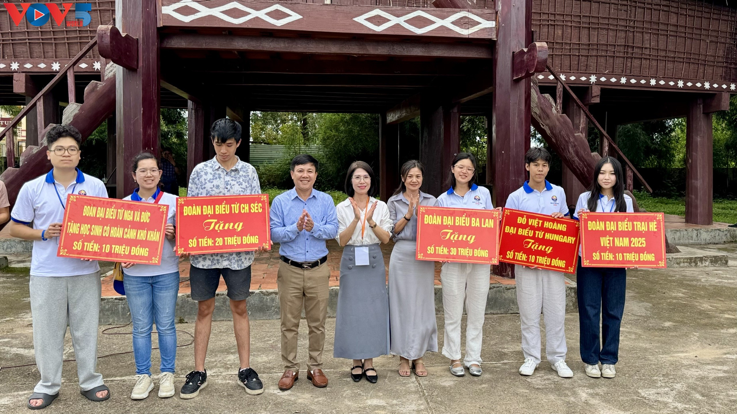 Cùng ngày, đoàn Trại hè đã đến thăm nhà Rông truyền thống tại thôn Kon Klor, phường Kon Tum, tỉnh Quảng Ngãi. Tại đây, đoàn đã trao tặng 80 triệu đồng cho các em học sinh có hoàn cảnh khó khăn tại địa phương. Số tiền này được đóng góp bởi các thành viên kiều bào từ nhiều quốc gia: đoàn từ Nga và Đức ủng hộ 10 triệu đồng, đoàn Cộng hoà Séc ủng hộ 20 triệu đồng, đoàn Ba Lan ủng hộ 30 triệu đồng, đoàn Trại hè ủng hộ 10 triệu đồng và em Đỗ Việt Hoàng, kiều bào Hungary ủng hộ 10 triệu đồng. Chia sẻ về hoạt động thiện nguyện, em Lê Đức Tùng đại diện nhóm thanh thiếu niên đến từ Liên bang Nga, bày tỏ: