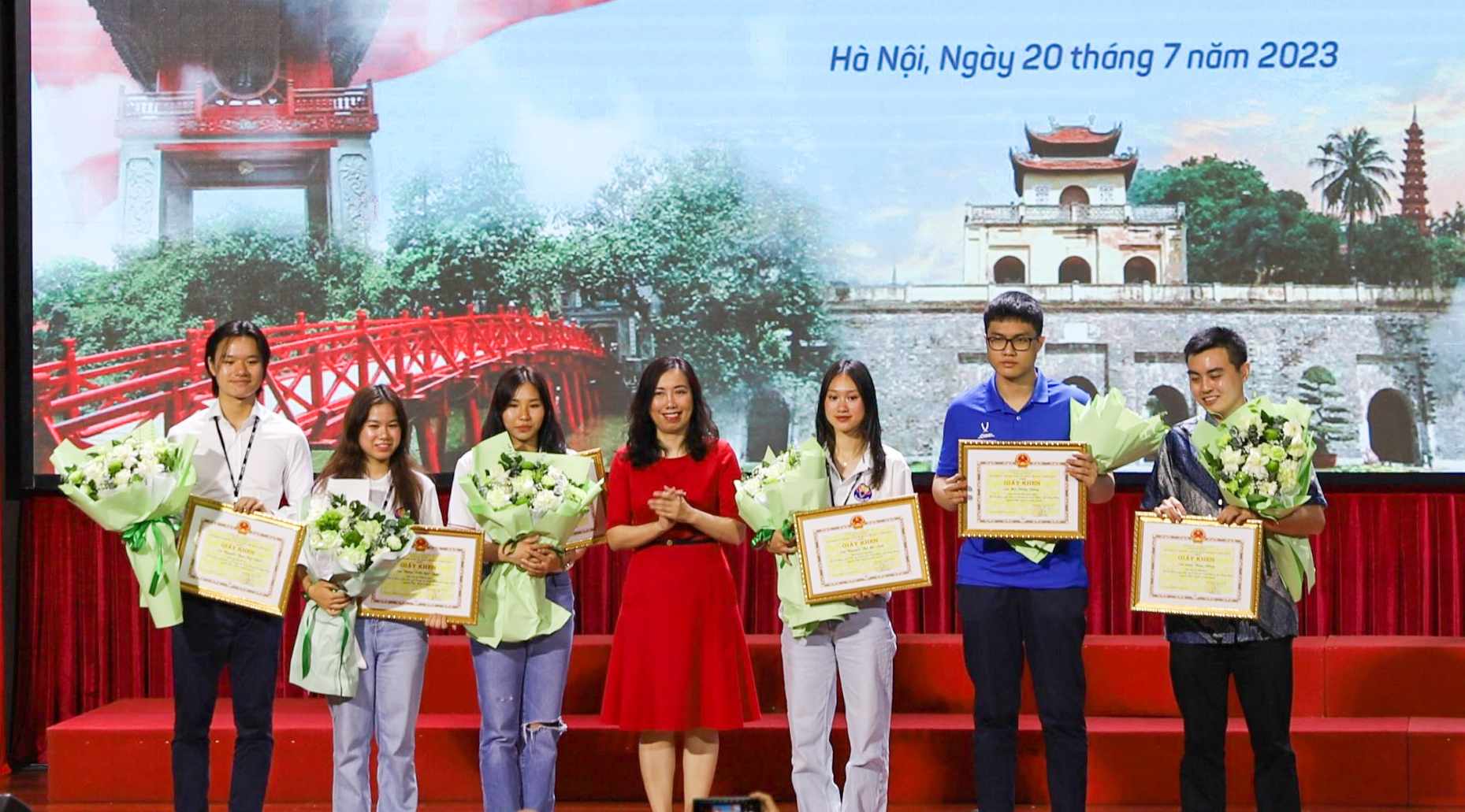 Thứ trưởng Bộ Ngoại giao Lê Thị Thu Hằng trao Giấy khen của Ủy ban Nhà nước về người Việt Nam ở nước ngoài cho các thanh niên kiều bào tiêu biểu. |