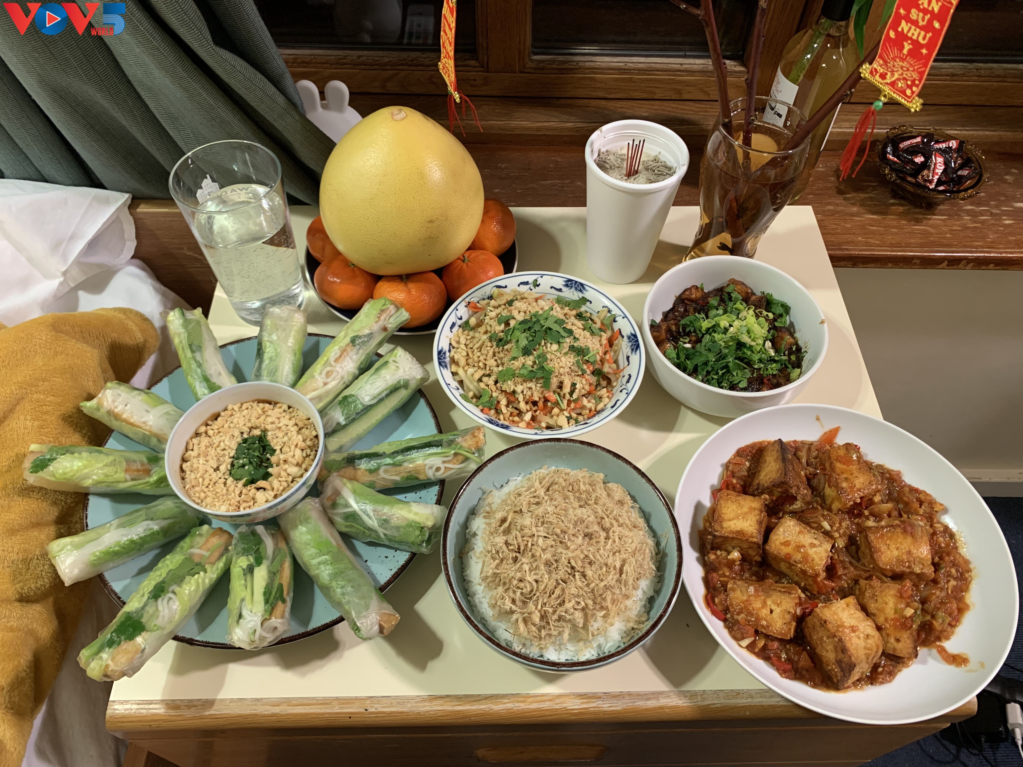 Mâm cỗ Tết với nem cuốn, nộm rau củ, xôi nếp,... do chính tay Viki và các bạn học chuẩn bị. Ảnh: NVCC. |
