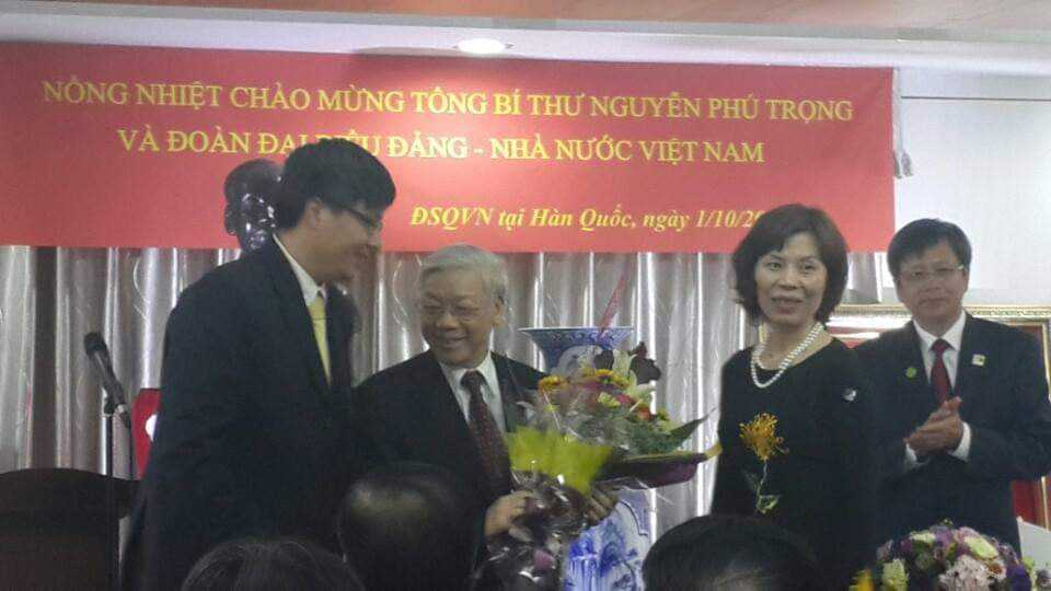 Tiến sĩ Trần Hải Linh cùng kiều bào tại Hàn Quốc tặng hoa Tổng Bí thư Nguyễn Phú Trọng trong chuyến thăm Hàn Quốc năm 2014 |