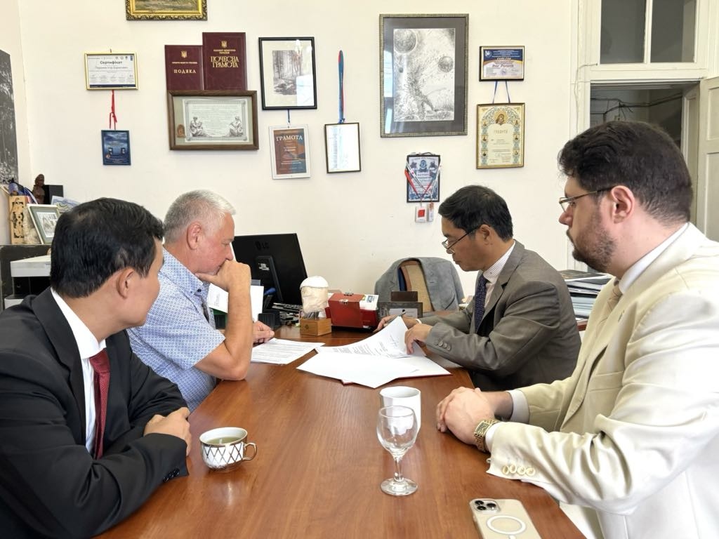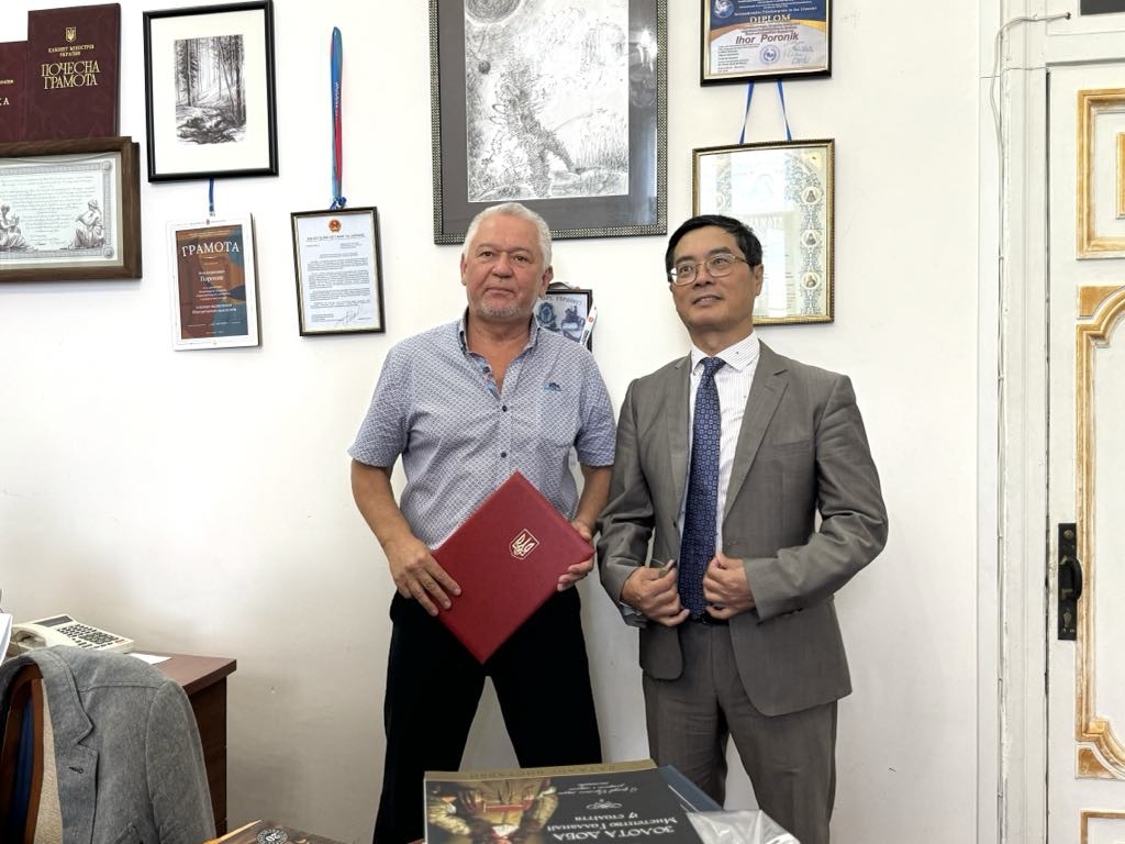 Giáo sư Andrey Gorchkov - cố vấn danh dự Đại sứ Nguyễn Hồng Thạch về văn hóa, Thành viên Hội đồng Qũy văn hóa Ukraine (ngồi bên phải) |