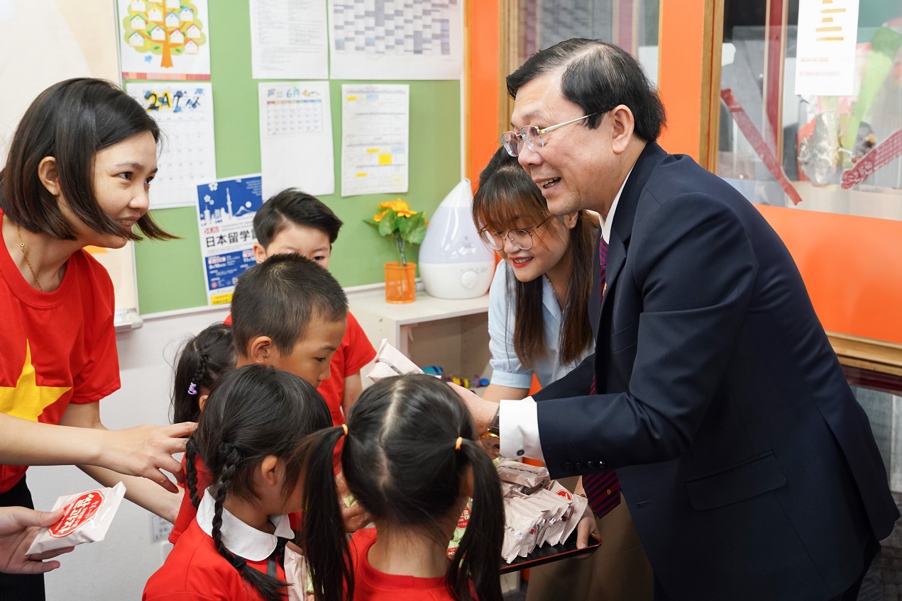 Ông Nguyễn Hữu Dũng, Phó Chủ tịch Ủy ban Trung ương Mặt trận Tổ quốc Việt Nam tặng quà cho các cháu nhỏ |