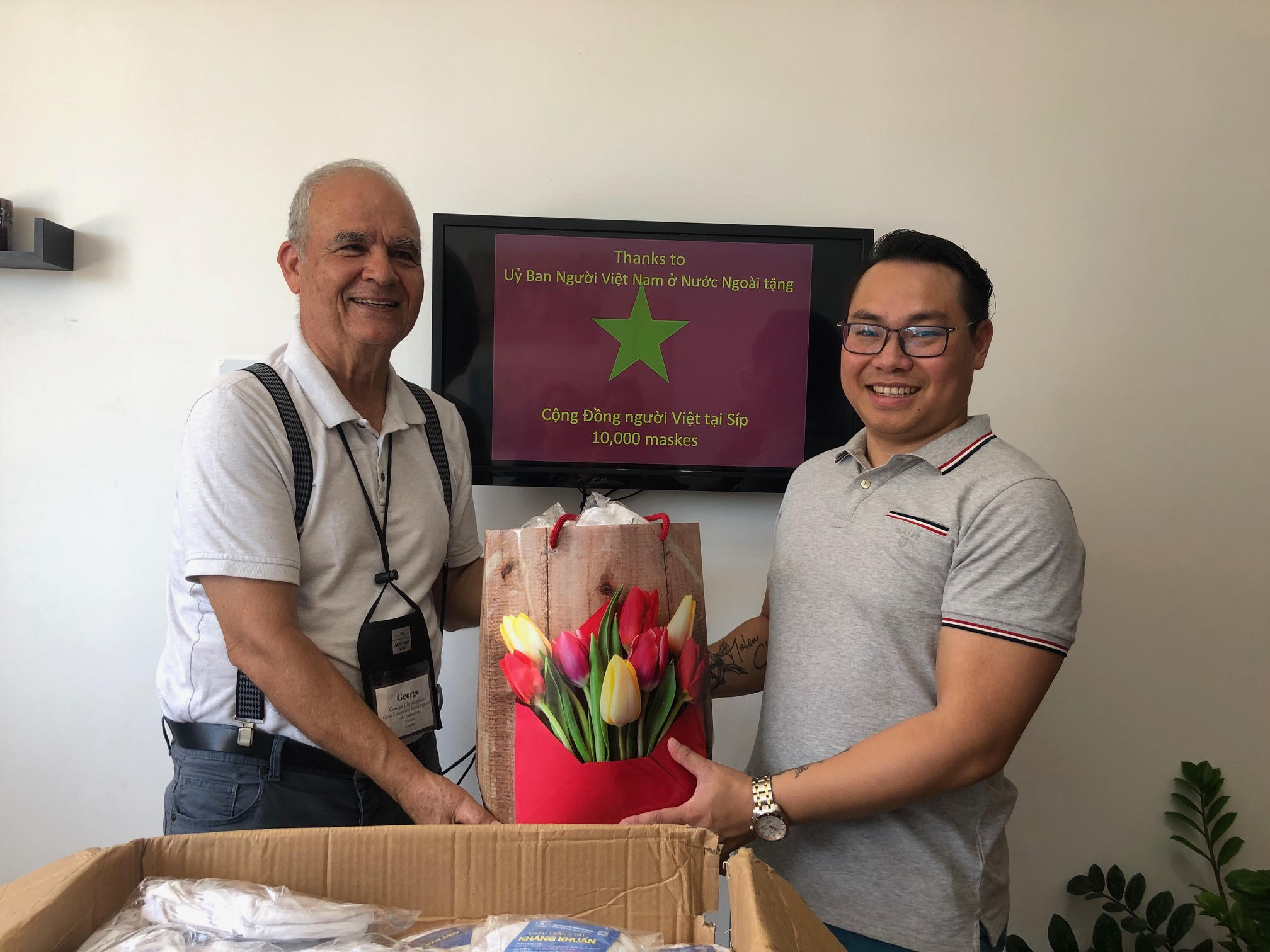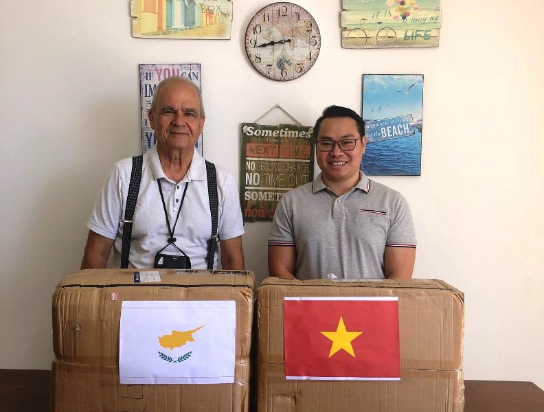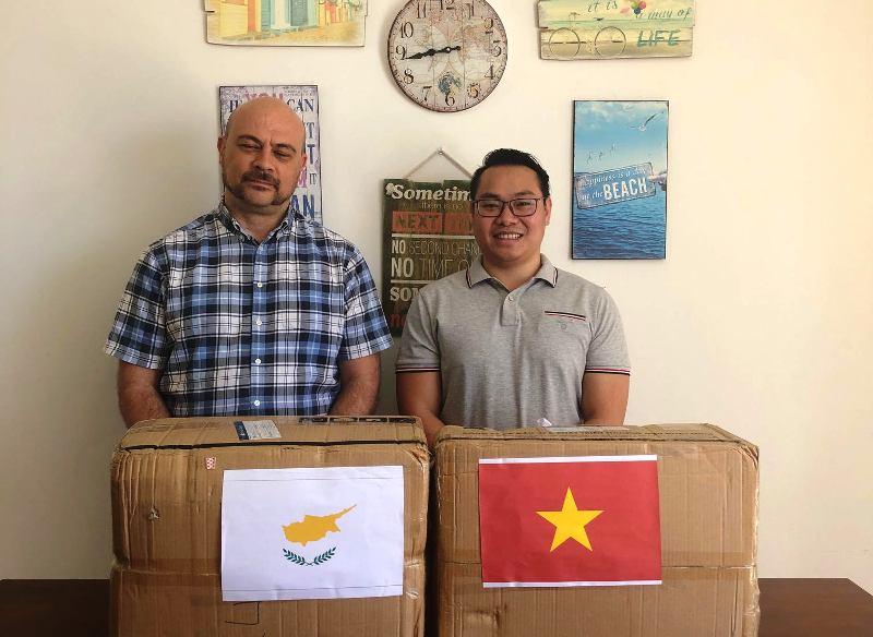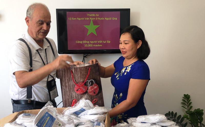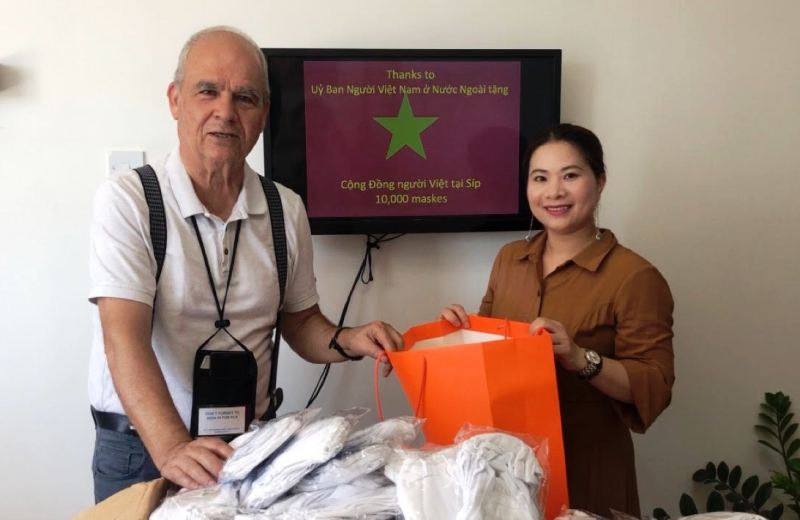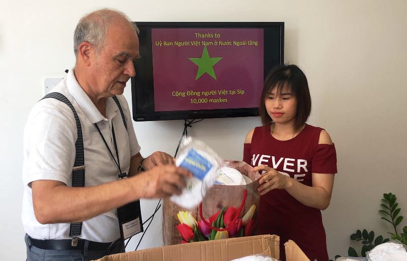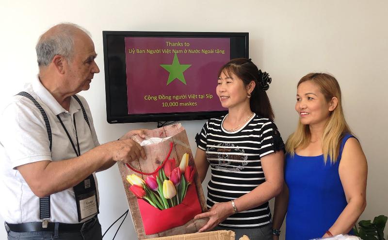 Được sự ủy quyền của Đại sứ quán Việt Nam tại Italy, Lãnh sự danh dự Việt Nam tại Cộng hòa Síp, ông Georgio Christophides và Ban Quản trị cộng đồng người Việt Nam tại Síp mới đây tổ chức lễ trao tặng 10.000 khẩu trang cho cộng đồng người Việt Nam tại Cộng hòa Síp. Đây là món quà của Chính phủ Việt Nam được Ủy Ban về Người Việt Nam ở nước ngoài chuyển sang.