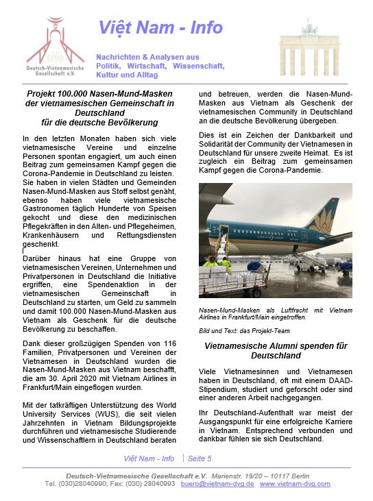 Thời gian qua, báo chí Đức cũng đã có nhiều bài viết ca ngợi Việt Nam trong cuộc chiến chống Covid-19 và sự quảng đại của Việt Nam trên bình diện quốc tế. Dù là một nước đang chịu ảnh hưởng của đại dịch nhưng Việt Nam sẵn sàng chia sẻ nguồn lực, hỗ trợ y tế và tạo điều kiện thuận lợi cho công dân các nước thời gian qua ở Việt Nam. Bộ Ngoại giao Đức ghi nhận và đánh giá cao nghĩa cử cao đẹp của người Việt Nam đang sinh sống tại Đức đã trao tặng khẩu trang y tế trang bị cho các đơn vị “tuyến đầu” chống dịch ở Đức.