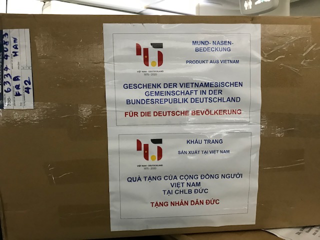 Với sự giúp đỡ của Đại sứ quán Việt Nam tại CHLB Đức, ban tổ chức đã liên hệ với Thượng viện Đức để trao tặng món quà này. Tổ chức Hỗ trợ Đại học thế giới CHLB Đức (WUS), một đơn vị đại diện cho Thượng viện Đức, đã đứng ra nhận quà và sau đó tiến hành chia cho 16 bang của nước Đức. Tiến sĩ Kambiz Ghawami, Chủ tịch Tổ chức Hỗ trợ Đại học thế giới CHLB Đức, cho biết: “Không chỉ tặng khẩu trang, thời gian qua, nhiều người Việt ở Đức cũng tặng các suất ăn miễn phí cho các viện dưỡng lão, lực lượng cứu hỏa và y bác sĩ. Đây là việc làm mẫu mực và không thể so sánh với bất kỳ một cộng đồng người nước ngoài nào khác đang sinh sống tại Đức”.
