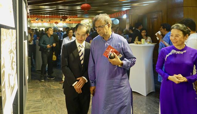 Đại sứ Trần Văn Khoa và phu nhân giới thiệu với Bộ trưởng, Quốc Vụ khanh Văn hóa Bangladesh KM Khalid (đứng giữa) về Triển lãm ảnh "Dấu ấn Chủ tịch Hồ Chí Minh". |