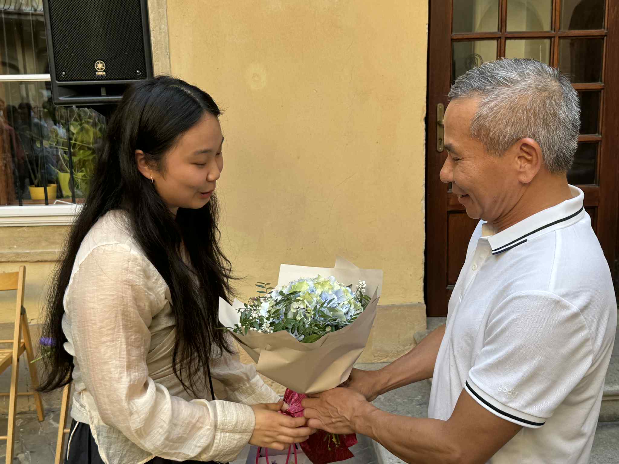 Tác giả Kvet Nguyen (bìa trái ) nhận hoa chúc mừng tại triển lãm. Ảnh nguồn: Phuong Vo |