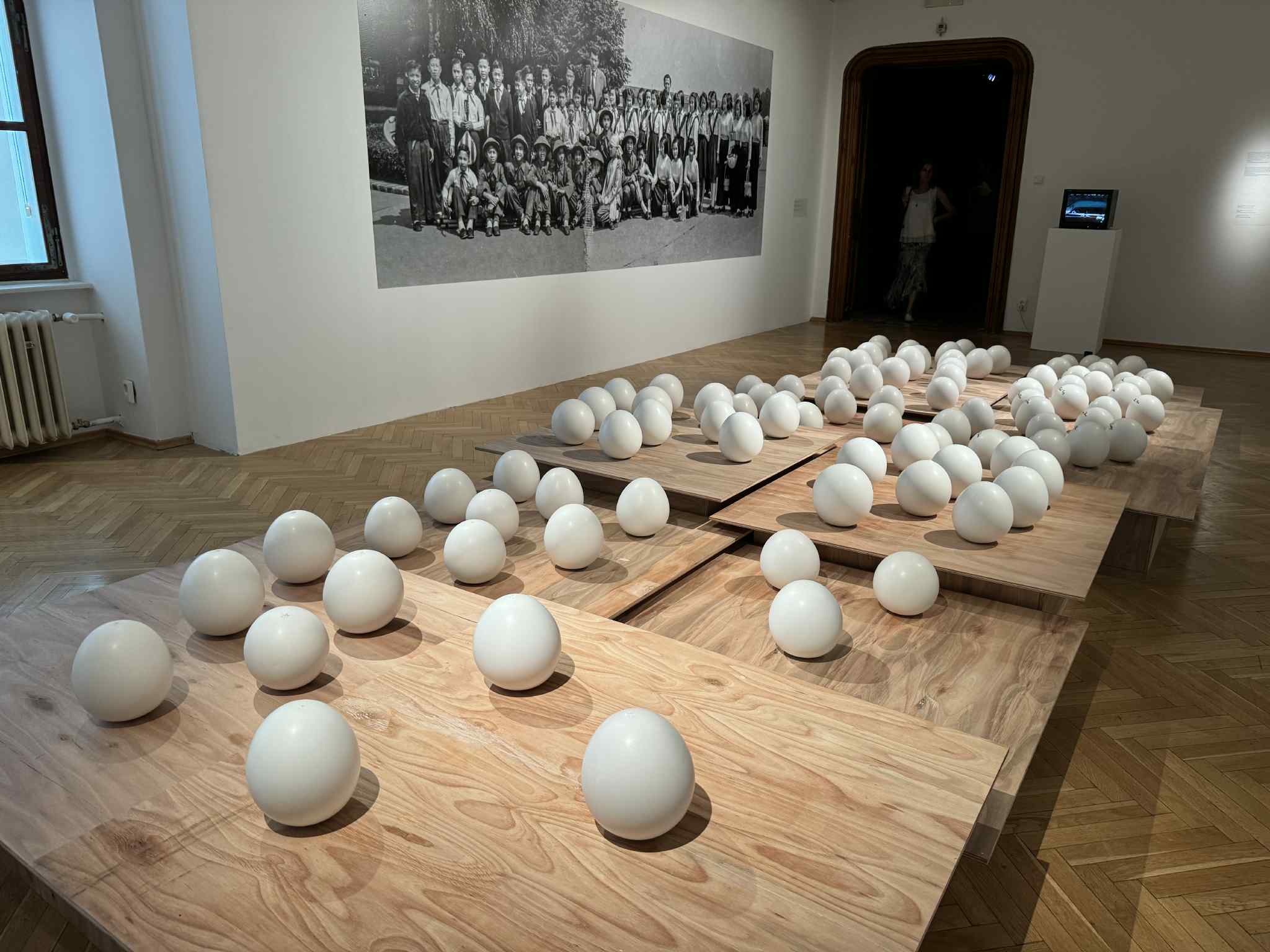 Truyền thuyết về sự ra đời của dòng giống Lạc Hồng được tái hiện với 100 quả trứng. Bên trên là bức ảnh 100 thiếu nhi Việt Nam đầu tiên đến thị trấn Chrastava của huyện Liberec, Cộng hòa Séc, vào năm 1956. Ảnh nguồn: Phuong Vo. |
