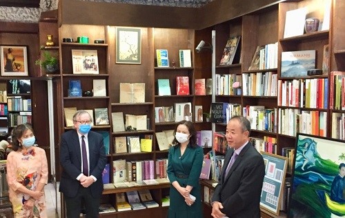 Đại sứ Nguyễn Thiệp và Đại sứ Trần Thị Hoàng Mai và các nhà nghiên cứu Pháp tại lễ khai mạc triển lãm ngày 12-9. Nguồn nhandan.com.vn |