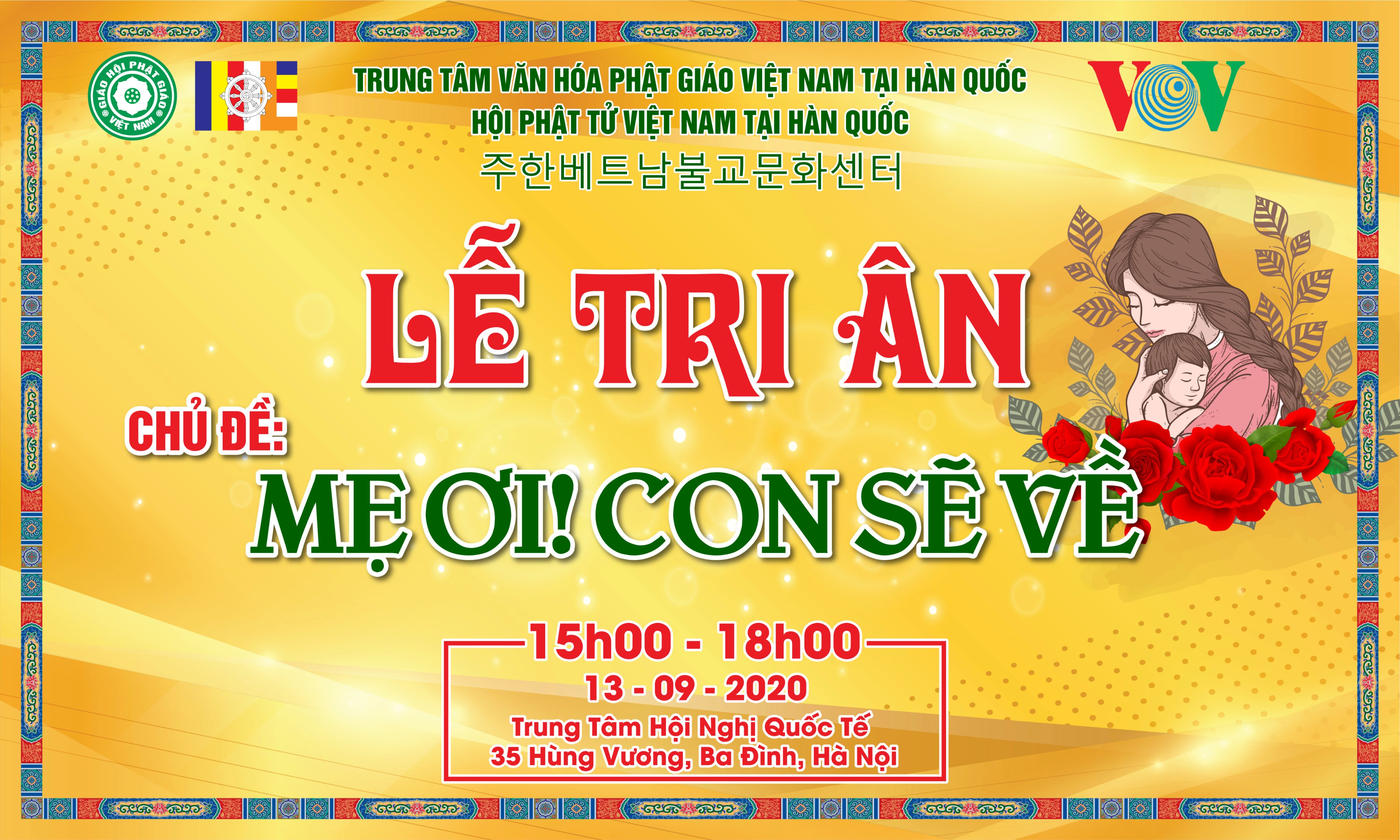 15h, Chủ nhật, ngày 13/9 tới, Trung tâm Văn hóa Phật giáo Việt Nam tại Hàn Quốc và Hội Phật tử Việt Nam tại Hàn Quốc tổ chức Lễ Tri ân, báo hiếu công đức tổ tiên, ông bà cha mẹ đã sinh thành, nuôi dưỡng con cái nên người tại Trung tâm Hội nghị Quốc tế, 35, đường Hùng Vương, Hà Nội.
