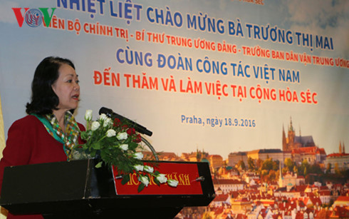 Đoàn đã lắng nghe tâm tư nguyện vọng và giải đáp một số thắc mắc của bà con liên quan tới tình hình ở trong nước và công tác đối với Việt Kiều ở nước ngoài. Phát biểu tại buổi làm việc, bà Trương Thị Mai đánh giá cao mô hình tổ chức, hoạt động của Hội người Việt Nam tại Cộng hòa Czech đã tập hợp và phát triển thành một mạng lưới các chi hội, đoàn thể thành viên trực thuộc tại hầu hết các tỉnh, thành của Cộng hòa Czech. Các hoạt động đều đa dạng, thu hút đông đảo người Việt và thậm chí người Cộng hòa Czech tham gia, góp phần quảng bá hình ảnh Việt Nam và thúc đẩy sự hội nhập của người Việt tại Séc.