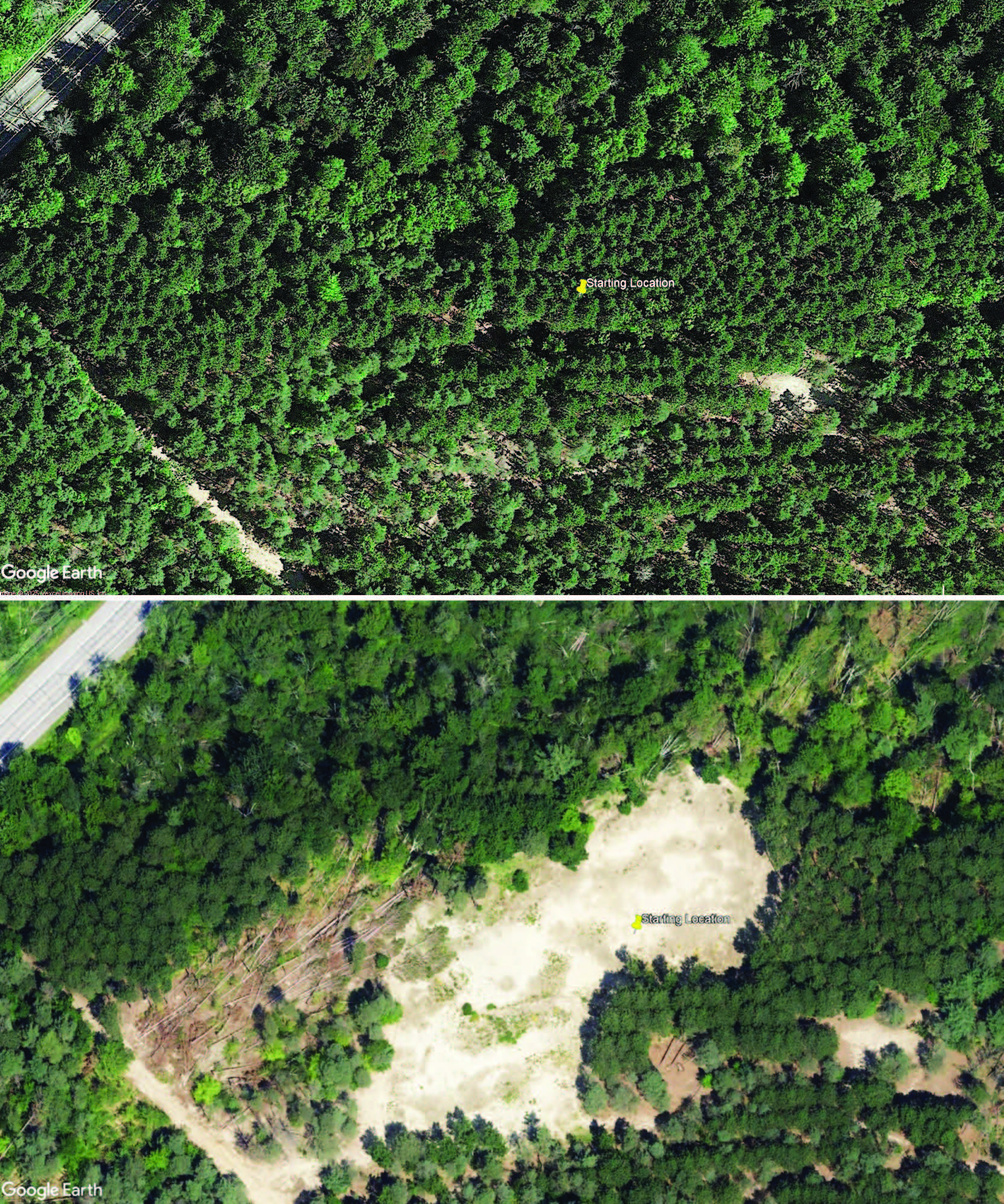 Ảnh vệ tinh: Trước khi phục hồi (ảnh trên): Rừng bao phủ. Sau khi đốn rừng (ảnh dưới): Đồi cát xuất hiện sau khi hàng nghìn cây gỗ rừng bị đốn bỏ. Ảnh: NVCC. |