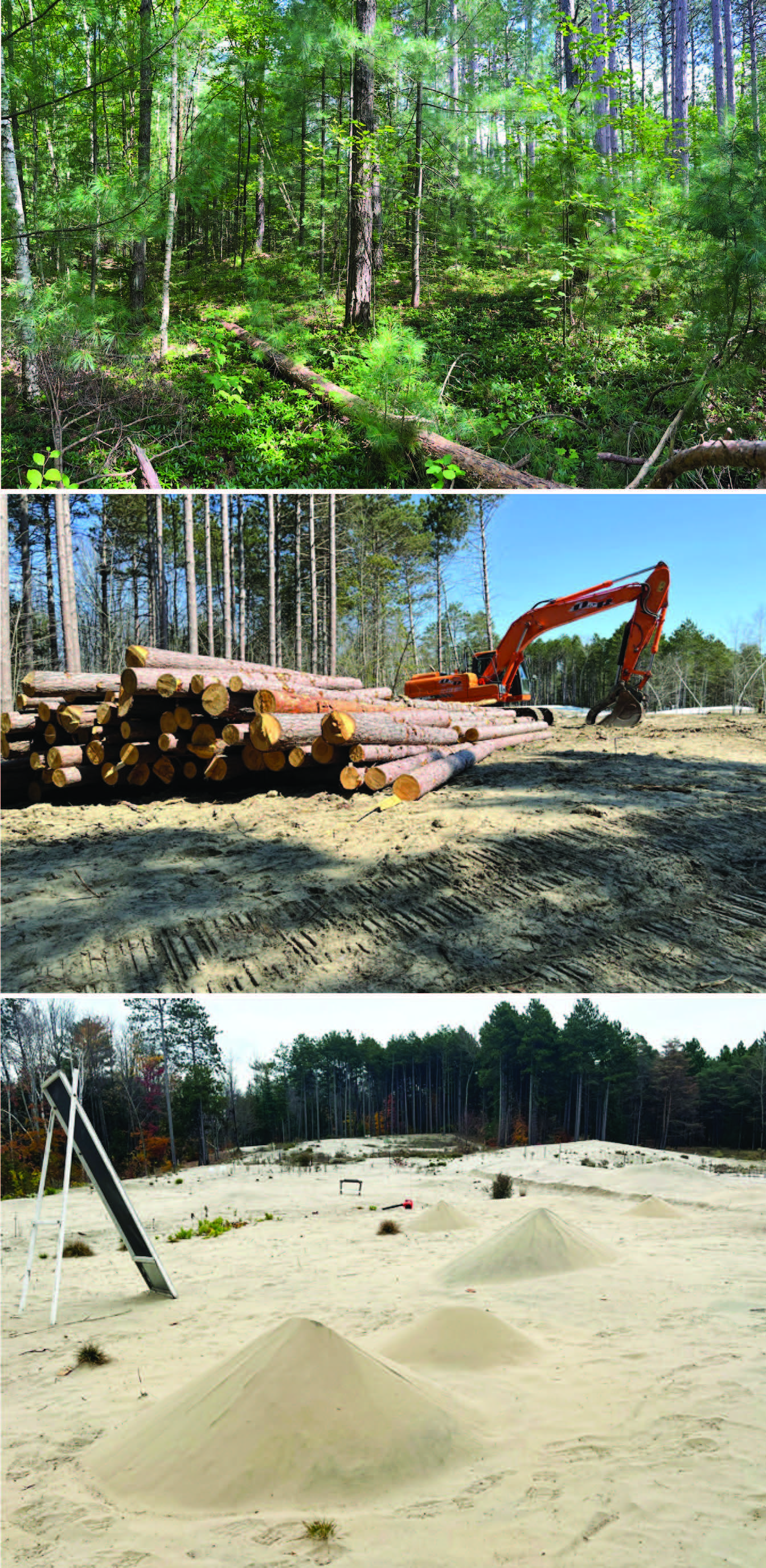 Ảnh trên cùng: Rừng bao phủ dày đặc. Ảnh giữa: Đốn rừng có kế hoạch - bước đầu cho sự phục hồi thiên nhiên. Ảnh dưới cùng: Đồi cát đang được phục hồi. Ảnh: NVCC. |