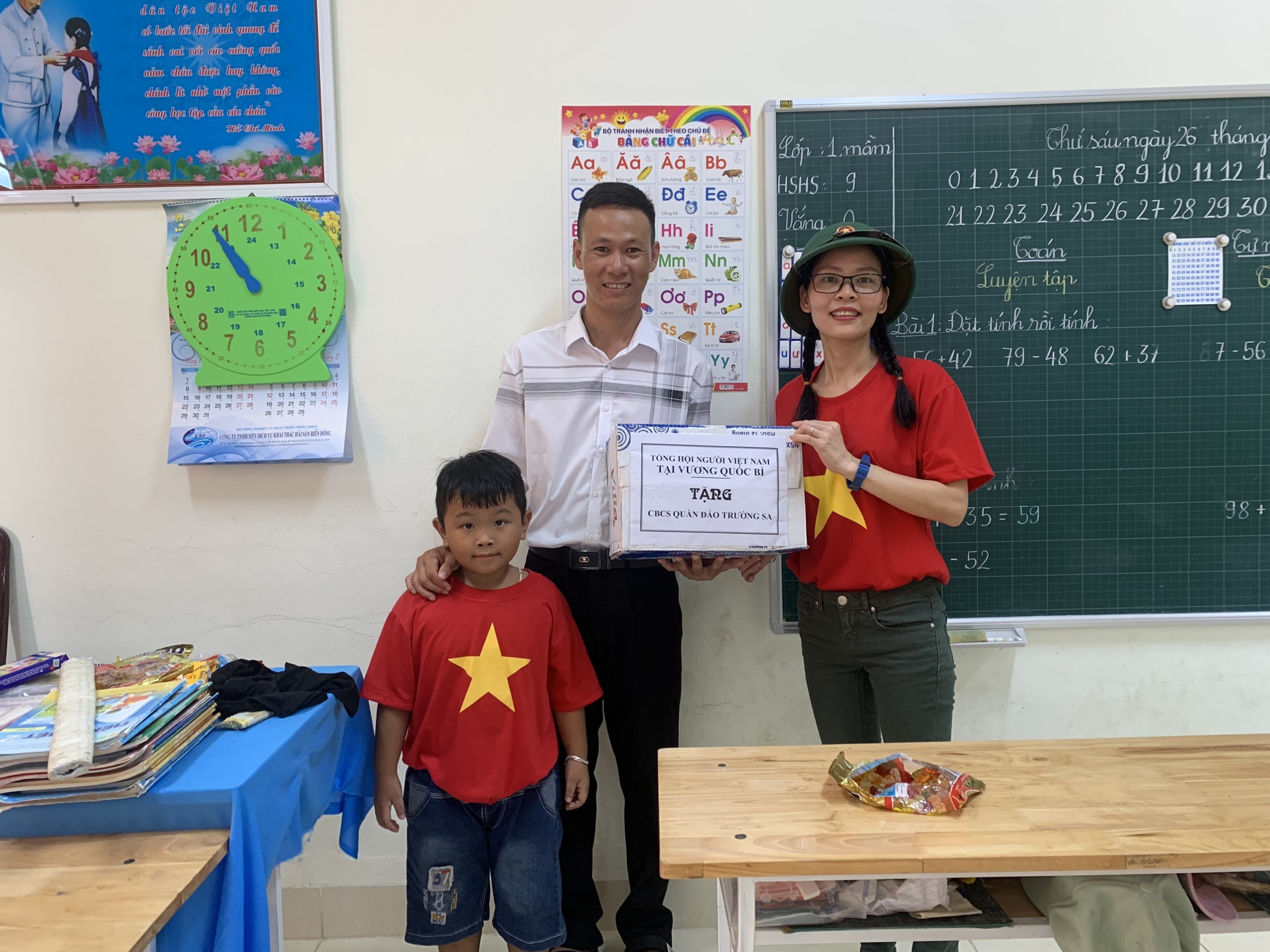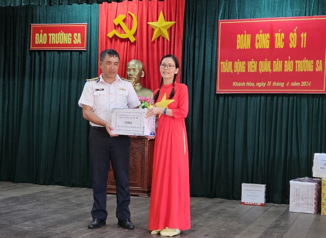 Chị Đào Thị Thu Hằng, đại diện cho Tổng hội người Việt Nam tại Vương quốc Bỉ, tặng quà cho thầy trò đảo Trường Sa.