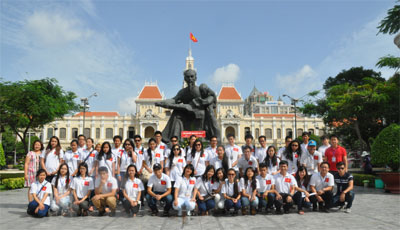 Các đại biểu Trại hè Việt Nam 2014 chụp ảnh lưu niệm trước tượng đài chủ tịch Hồ Chí Minh.