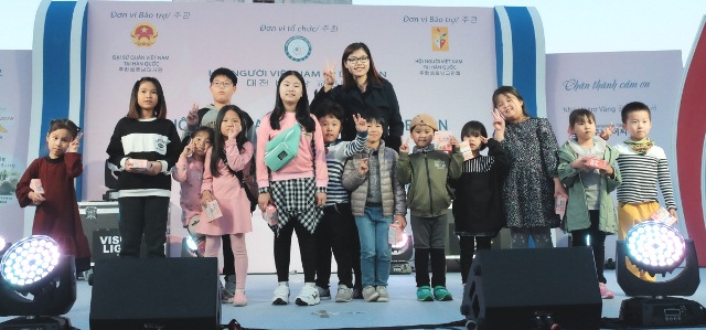 Các cháu bé gia đình đa văn hóa nhận quà sau khi tham gia trò chơi tại lễ hội.
