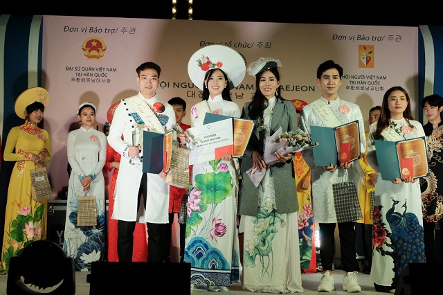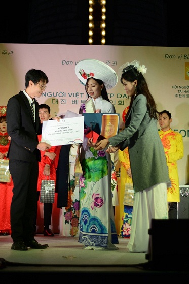 Anh Trần Quang Đôn, Chủ tịch Hội người Việt Nam tại thành phố Daejeon, trao giải hoa khôi của cuộc thi Nét đẹp hội tụ cho thí sinh Ngô Kim Quyến.
