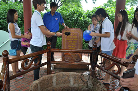 | Các bạn trẻ kiều bào múc nước giếng thanh mát của gia đình Tây Sơn tam kiệt rửa mặt |