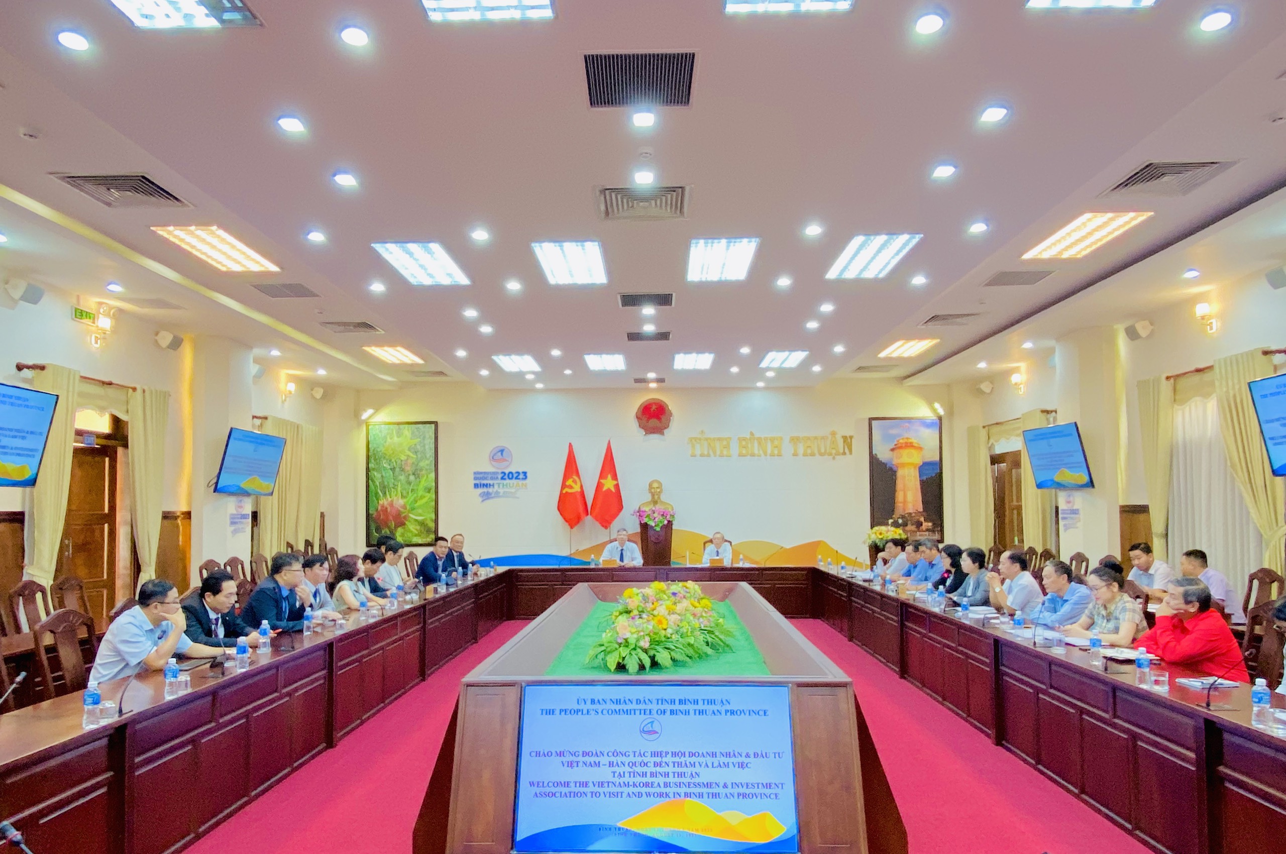 Ngày 19/8/2023, tại trụ sở UBND tỉnh Bình Thuận, ông Phan Văn Đăng, Phó Chủ tịch Thường trực UBND tỉnh Bình Thuận, cùng lãnh đạo các Sở ban ngành tỉnh Bình Thuận đã tiếp và làm việc với đoàn công tác Hiệp hội Doanh nhân & Đầu tư Việt Nam - Hàn Quốc (VKBIA).