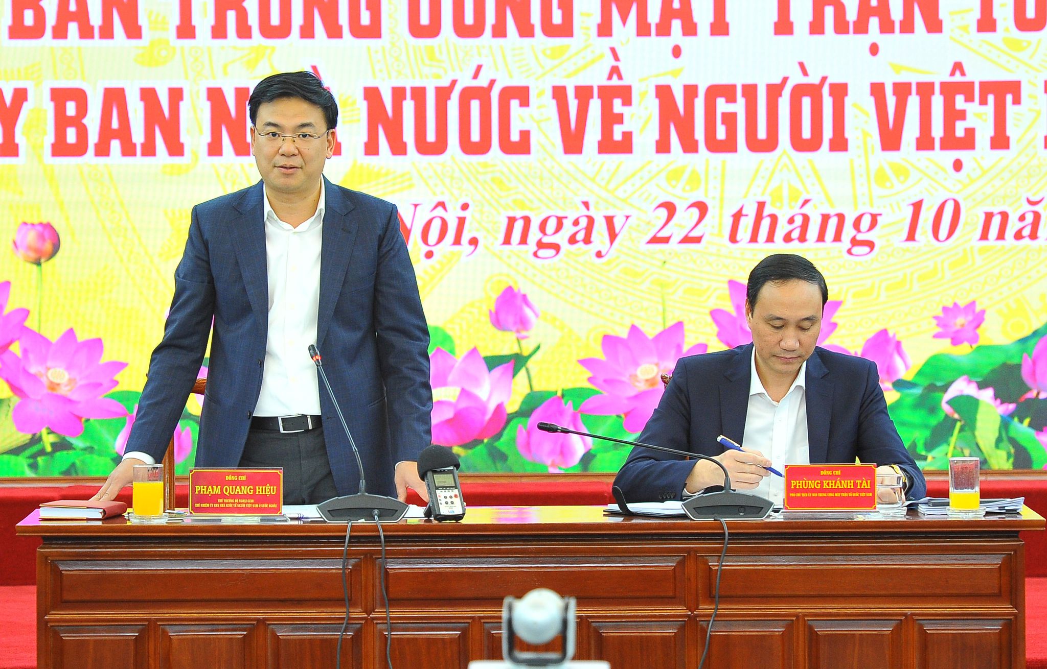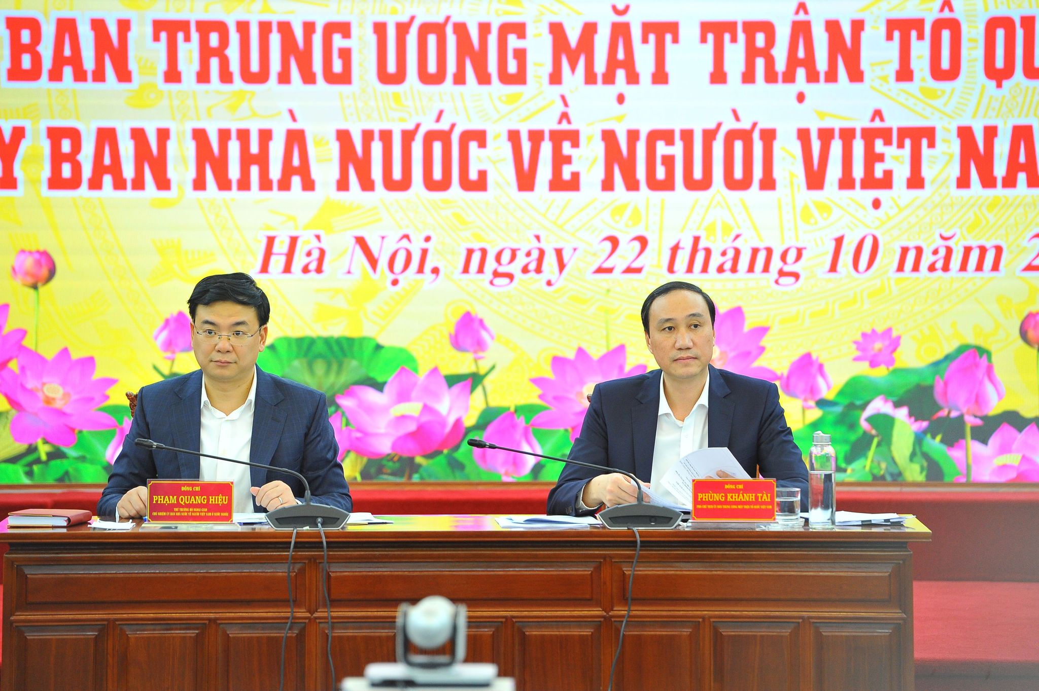 Chủ trì Hội nghị có ông Phùng Khánh Tài, Phó Chủ tịch Uỷ ban Trung ương Mặt trận Tổ quốc Việt Nam (bên phải) và ông Phạm Quang Hiệu, Thứ trưởng Bộ Ngoại giao, Chủ nhiệm Ủy ban Nhà nước về người Việt Nam ở nước ngoài (bên trái). |