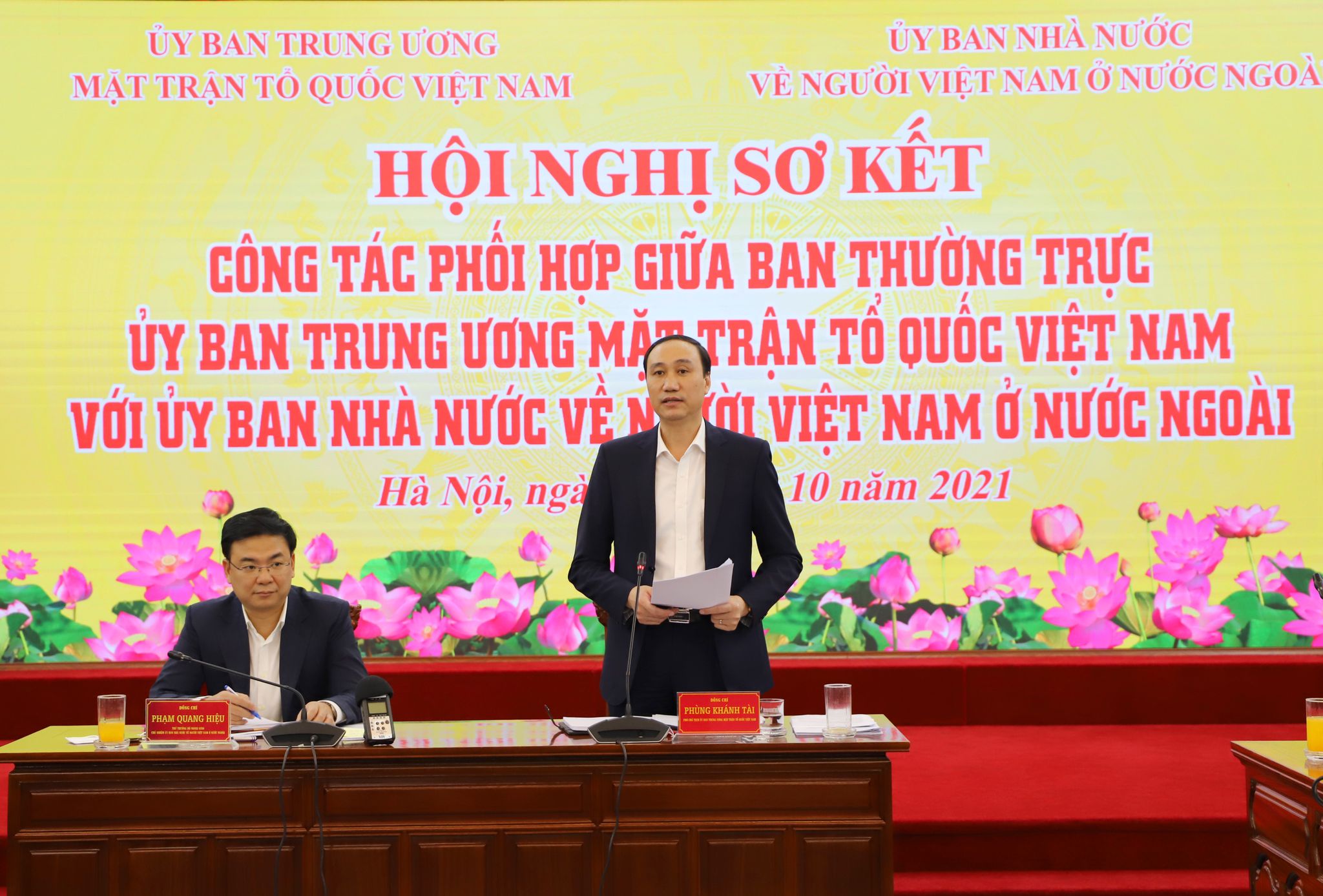 Chiều 22/10, Hội nghị sơ kết công tác phối hợp giữa Ban Thường trực Uỷ ban Trung ương Mặt trận Tổ quốc Việt Nam và Ủy ban Nhà nước về người Việt Nam ở nước ngoài, Bộ Ngoại giao được tổ chức tại Hà Nội. Hội nghị nhằm đánh giá những kết quả đạt được trong công tác phối hợp giữa hai cơ quan trong thời gian qua và thống nhất một số phương hướng, trọng tâm phối hợp công tác trong thời gian tới.