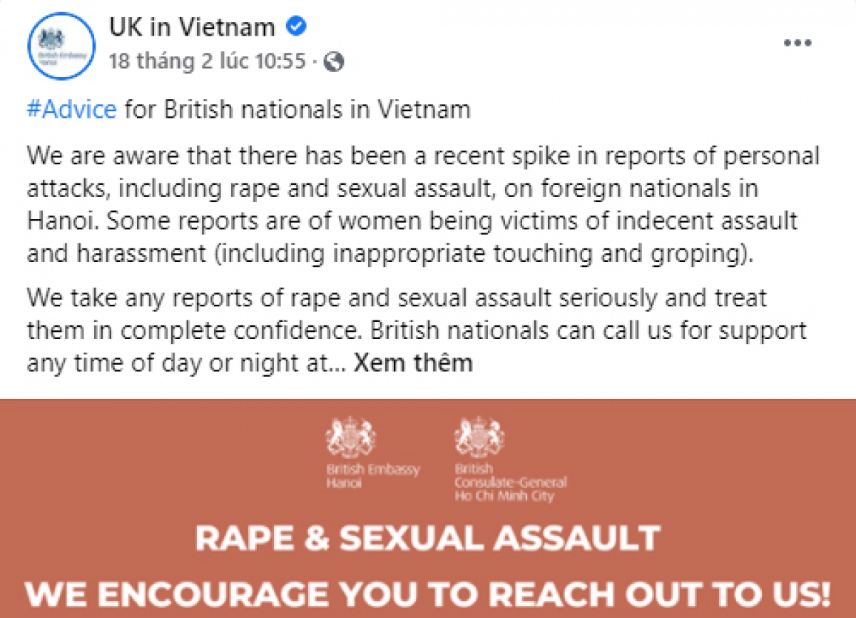 Trả lời câu hỏi về việc Đại sứ quán Anh tại Việt Nam mới đây đăng trên Facebook cảnh báo công dân Anh về số vụ tấn công người nước ngoài gia tăng tại thủ đô Hà Nội, tại họp báo thường kỳ chiều 25/2, Người Phát ngôn Bộ ngoại giao Lê Thị Thu Hằng cho biết Cục lãnh sự Bộ ngoại giao đã trao đổi với Đại sứ quán Anh tại Hà Nội để làm rõ thông báo của Đại sứ quán.Bộ ngoại giao cũng đã trao đổi với các cơ quan chức năng của VN để xác minh thông tin và phối hợp xử lý các vụ việc như Sứ quán Anh nêu. Cần khẳng định Việt Nam luôn coi trọng công tác đảm bảo an ninh, trật tự, an toàn cho người dân trong nước và cộng đồng người nước ngoài ở Việt Nam, phát hiện và xử lý nghiêm các hành vi vi phạm pháp luật.