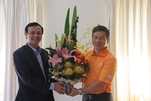 | Đại sứ Lương Thanh Nghị (trái) tặng hoa chúc mừng ông Chu Quang Hòa. Ảnh: Khánh Linh/TTXVN |
