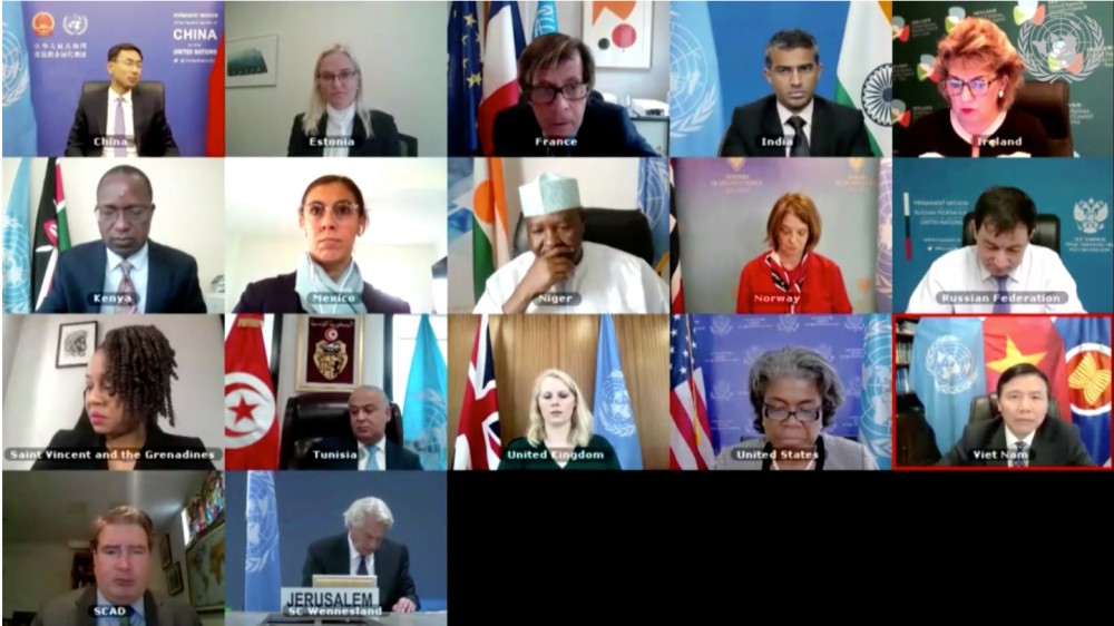 Hội đồng Bảo an Liên hợp quốc họp trực tuyến công khai về tình hình Trung Đông, bao gồm vấn đề Palestine. Ảnh:baoquocte.vn |