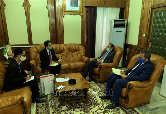 Đại sứ Nguyễn Thành Vinh trao đổi và làm việc với ông Abdelmadji Chikhi.- Ảnh: Tấn Đạt/TTXVN |