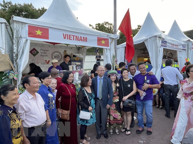 Đại sứ Việt Nam tại Pháp tham quan gian hàng Việt Nam tại Làng ẩm thực quốc tế Paris. Ảnh: Nguyễn Thu Hà/TTXVN |