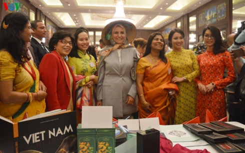 Gian trưng bày của Đại sứ quán Việt Nam nổi bật với các tà áo dài truyền thống, các mặt hàng thủ công mỹ nghệ, hàng tơ tằm, nón lá, các món ăn Việt Nam. Đông đảo du khách quốc tế ghé thăm gian hàng Việt Nam.
