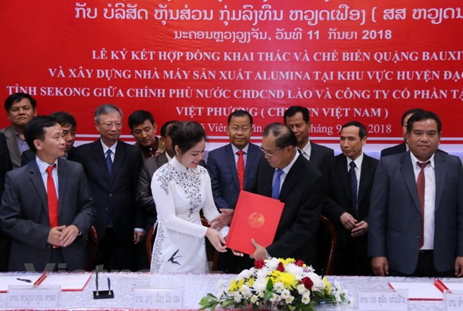 Chiều 11/9, tại Bộ Kế hoạch Đầu tư Lào, diễn ra lễ ký Hợp đồng Khai thác và chế biến quặng bauxite và xây dựng nhà máy sản xuất aluminat giữa Chính phủ Lào và đại diện Tập đoàn đầu tư Việt Phương (VPG) của Việt Nam.