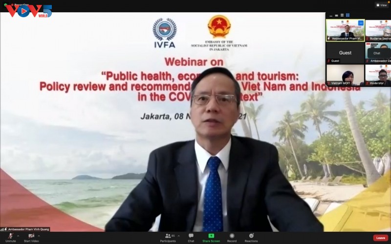 Ngày 8/11, Đại sứ quán Việt Nam tại Indonesia phối hợp với Hội hữu nghị Indonesia - Việt Nam tổ chức hội thảo trực tuyến “Hợp tác y tế, kinh tế và du lịch: Tổng kết và khuyến nghị chính sách cho Việt Nam và Indonesia trong bối cảnh đại dịch COVID-19”.