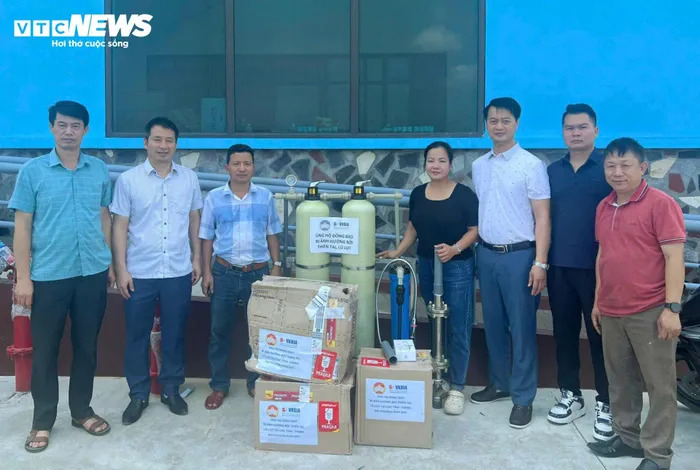 Thành viên đại diện Hiệp hội VKBIA bàn giao 180 đèn đeo đầu cứu hộ cứu nạn và hệ thống lọc nước đến UBND và Ban cứu trợ tỉnh Yên Bái. |