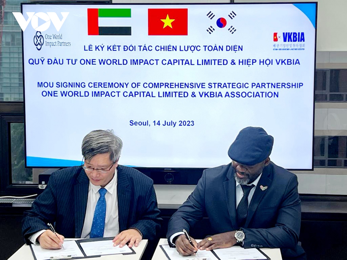 Ngày 14/7, tại Seoul, Hàn Quốc đã diễn ra lễ ký kết đối tác hợp tác chiến lược toàn diện giữa Hiệp hội Doanh nhân & Đầu tư Việt Nam – Hàn Quốc (VKBIA) và Quỹ đầu tư One World Impact Capital Limited (OWI) của Các Tiểu vương quốc Ả Rập Thống nhất (UAE).