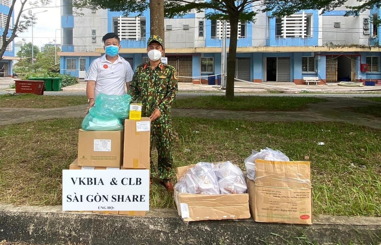 Hiệp hội VKBIA và “Saigon Share” đã trực tiếp trao tặng, ủng hộ 2 tấn gạo, 5200 trứng, 30 thùng mì nui ăn liền, 3 tấn rau củ Đà Lạt, 500kg chanh, các nhu yếu phẩm lương thực cần thiết khác và hơn 600 suất cơm cho các khu vực cách ly, phong tỏa, trung tâm dưỡng lão, các cơ sở tình thương và bà con lang thang cơ nhỡ gặp nhiều khó khăn bởi dịch bệnh.