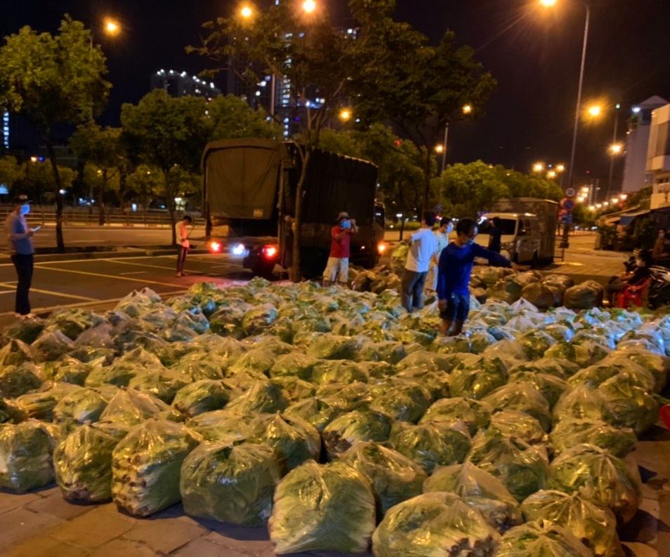 Sau đó Hiệp hội VKBIA và “Saigon Share” đã bố trí tình nguyện viên chờ sẵn tại đây để tiếp nhận, dỡ các kiện rau củ quả xuống địa điểm tập kết và nhanh chóng phân phối sang các xe vận tải nhỏ hoặc xe bán tải, sau đó tiếp tục trực tiếp trao tặng nguồn thực phẩm này cho các bệnh viện điều trị và bệnh viện dã chiến, các bếp thiện nguyện, các bếp của trung tâm dưỡng lão, cơ sở tình thương, và trực tiếp trao cho các khu vực cách ly, phong tỏa nơi có nhiều người dân đang gặp phải khó khăn, hoặc thiếu điều kiện chuẩn bị nguồn nhu yếu phẩm cần thiết.