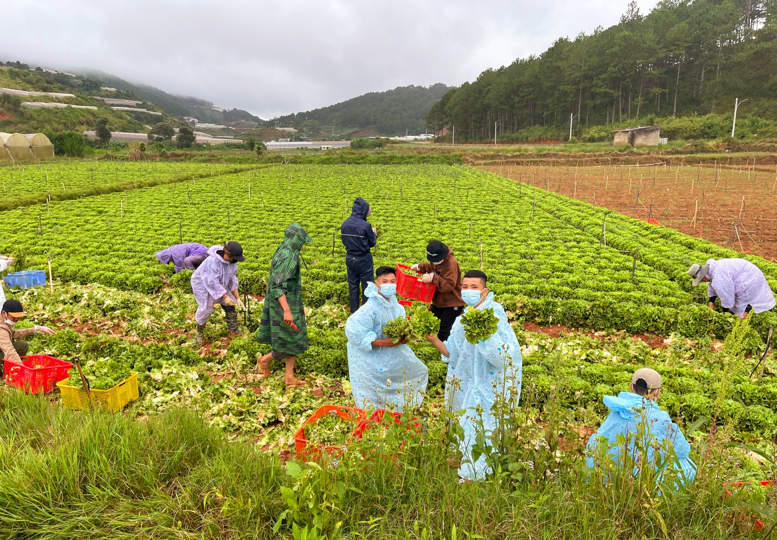 Các tình nguyện viên thu hoạch và đóng gói rau tại Lâm Đồng để chuyển về Thành phố Hồ Chí Minh. |