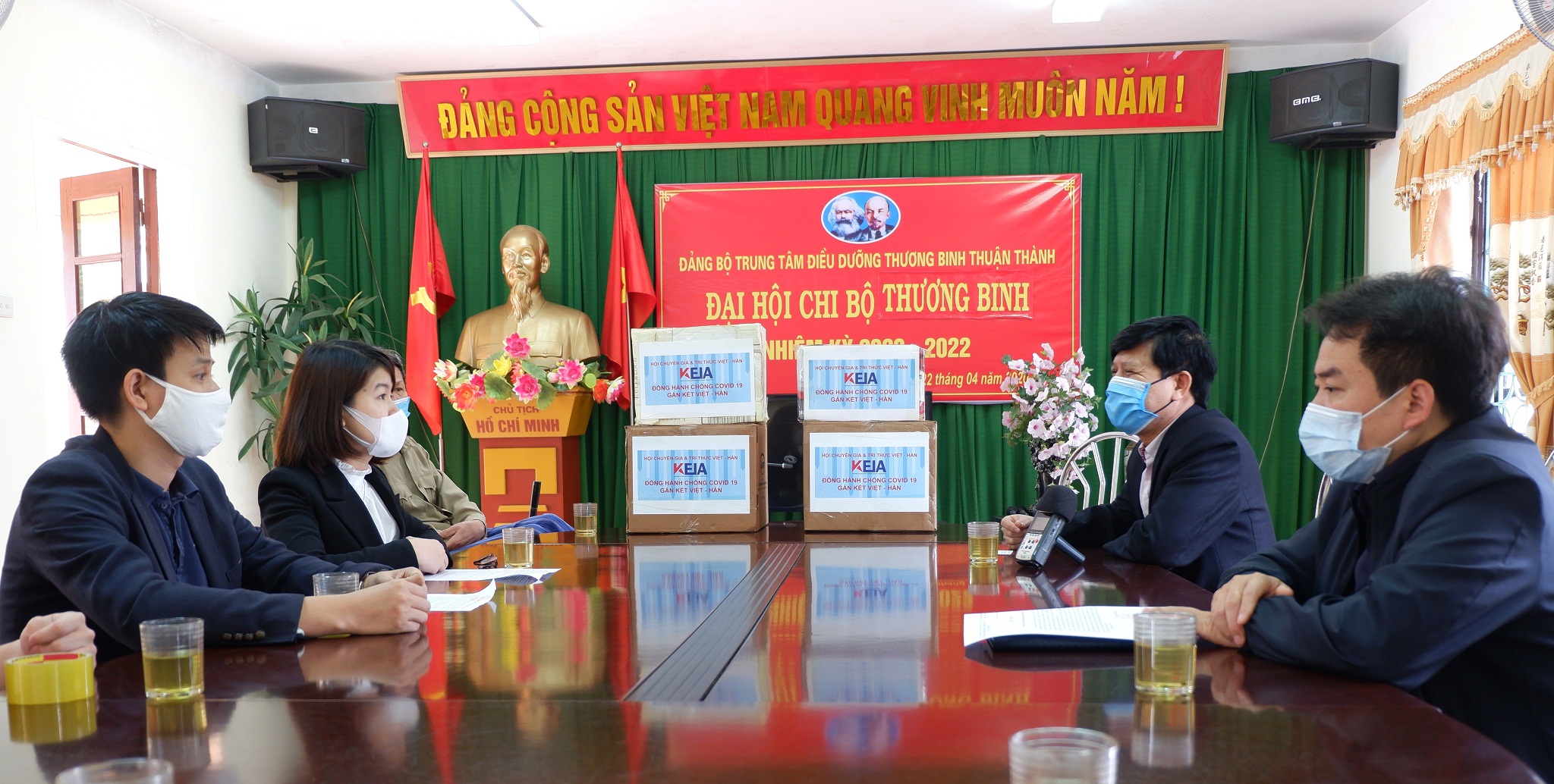 Cũng trong chiều 24/4, Hội Chuyên gia Trí thức Việt Nam – Hàn Quốc (VKEIA) đến thăm hỏi và trao quà phòng chống dịch Covid-19 cho Trung tâm Điều dưỡng thương binh Thuận Thành, tỉnh Bắc Ninh. Số quà trao tặng gồm 1.000 chiếc khẩu trang và 194 Gel rửa tay NanoCareVN sát khuẩn.