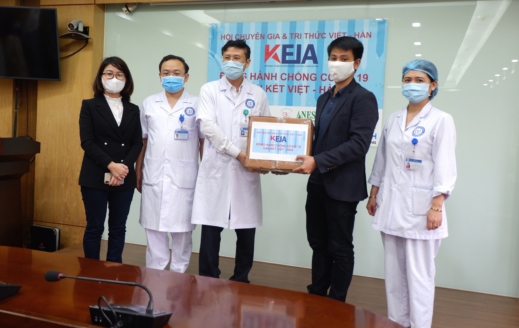 Chiều 24/4, tại Bệnh viện Nội tiết Trung ương, Hội Chuyên gia Trí thức Việt Nam – Hàn Quốc (VKEIA) trao tặng 3.000 khẩu trang y tế và 200 Gel rửa tay NanoCareVN diệt khuẩn cho Bệnh viện với mục đích góp phần chung tay đẩy lùi dịch bệnh.